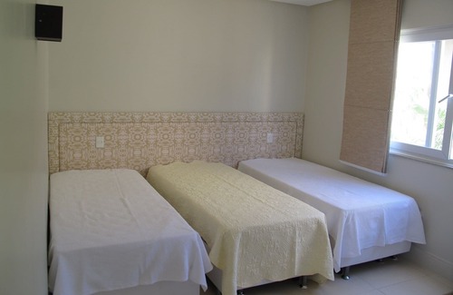 House with thirteen suites and a maid's quarters. In the social area there is a bathroom, another social bathroom on the roof, a toilet on the ground floor. 3 storey house. Full kitchen with stove, two refrigerators, vertical freezer, two electric ovens, microwave, filter, cooking utensils. All ground rooms have two exits. With cafe area, with an espresso machine in the 65m2 lounge. All accessories for a dining table with 10 seats. Gourmet area in front of the beach, with a table with 12 seats. Parking spaces for two cars. Most rooms have double beds, and others with two single beds. The sides of the rooms are decorated with plants.