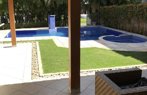 Townhouse with 4 large bedrooms and 2 suites, comfortably sleeps 16 people between double and single beds. It has tv room, dining room, living room and fireplace, dining room and kitchen. It has maid's room Pool structure with bathroom, barbecue and oven for pizza. Parking for 4 vehicles. Privileged location for access to the beach. The condo offers transportation to the beach and umbrella and chairs.
