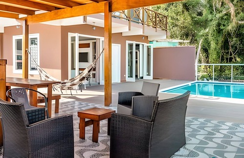 Casa da Feiticeira is ideal for families and groups of friends who want to enjoy Ilhabela in comfort and style. Just 500 meters from Praia da Feiticeira, the house accommodates up to 9 people and offers a complete leisure area with swimming pool, barbecue and sun loungers. Take advantage of the excellent location and explore the island on foot!